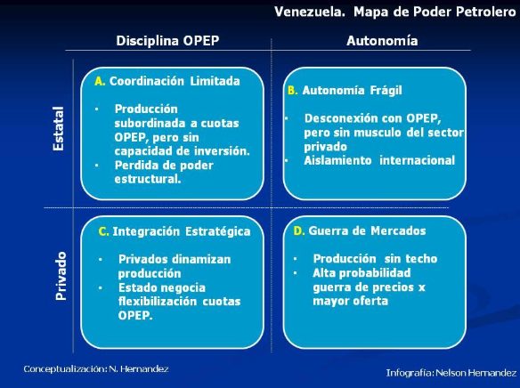 La gráfica a continuación presenta un mapa de poder petrolero para Venezuela, con 4 escenarios, dependiendo de la cupla Estado – Privado y OPEP – No OPEP.